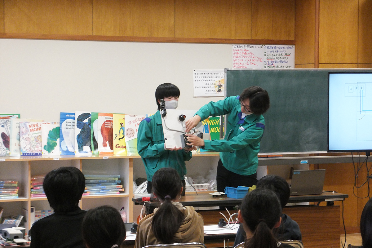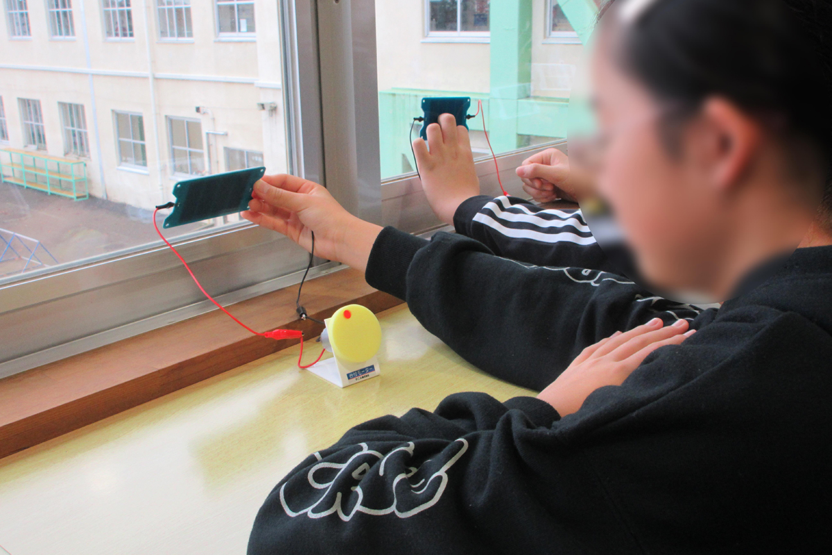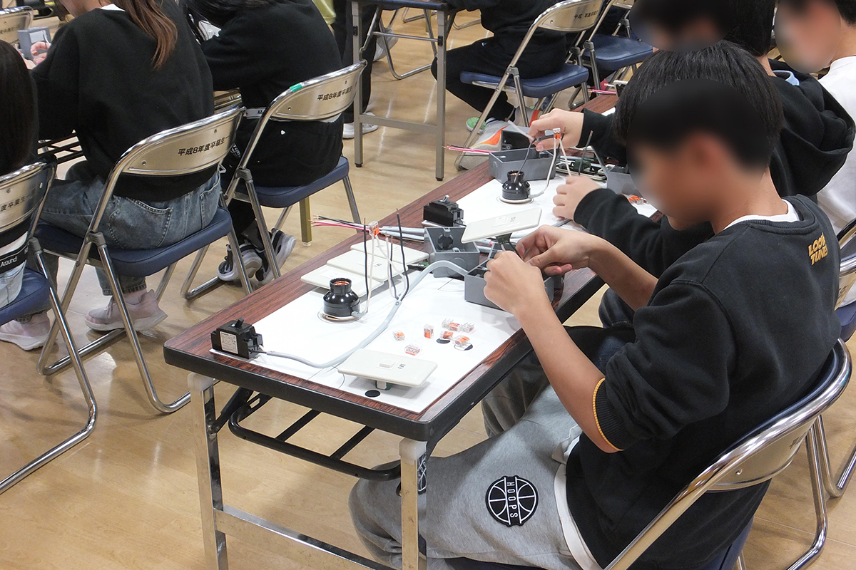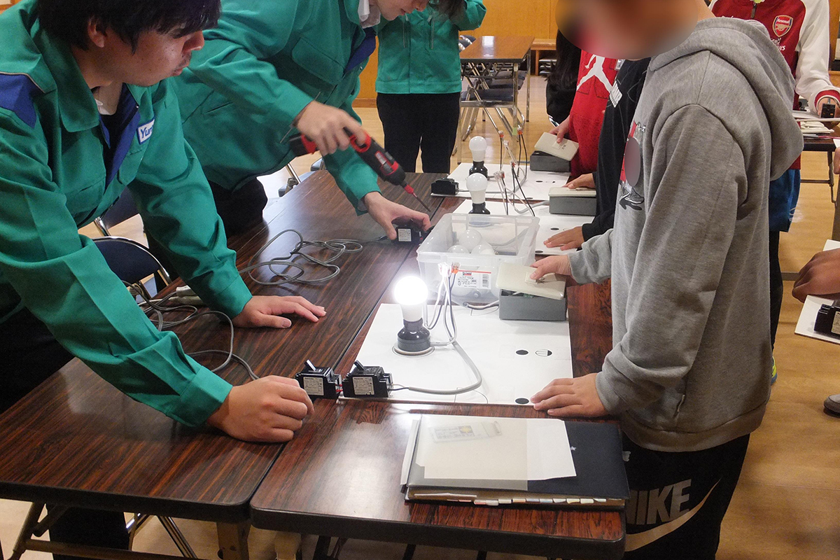 電気は様々な製品に使われていて、自分たちの生活に欠かせないものであることを改めて学習したうえで、電気はどのように作られて家や学校等に送られてくるのかを学んだ。また、手回し発電実験では、電気は光や動力などに変換することができるとともに少量であれば蓄電できることを学習した。電気工事模擬実習では、照明・スイッチ複線図をもとにブレーカーやスイッチボックス、ランプレセプタクル(電球のソケット)、コンセントなどの各電子部品を配線でつないだ。最後に、スイッチを入れて電球が点灯するか、コンセントに電気が通っているかを確認した。
