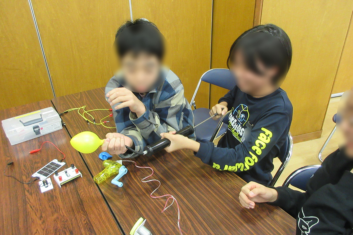 - ふうせんでプロペラをまわしたり、モーターに発電機をつないでまわしたりして、電気のことをまなべました。他には白、黒の線をつなげて電球をつけ、スイッチをいれて光ったときはうれしかったです。電気のことにちょっときょうみをもちました。