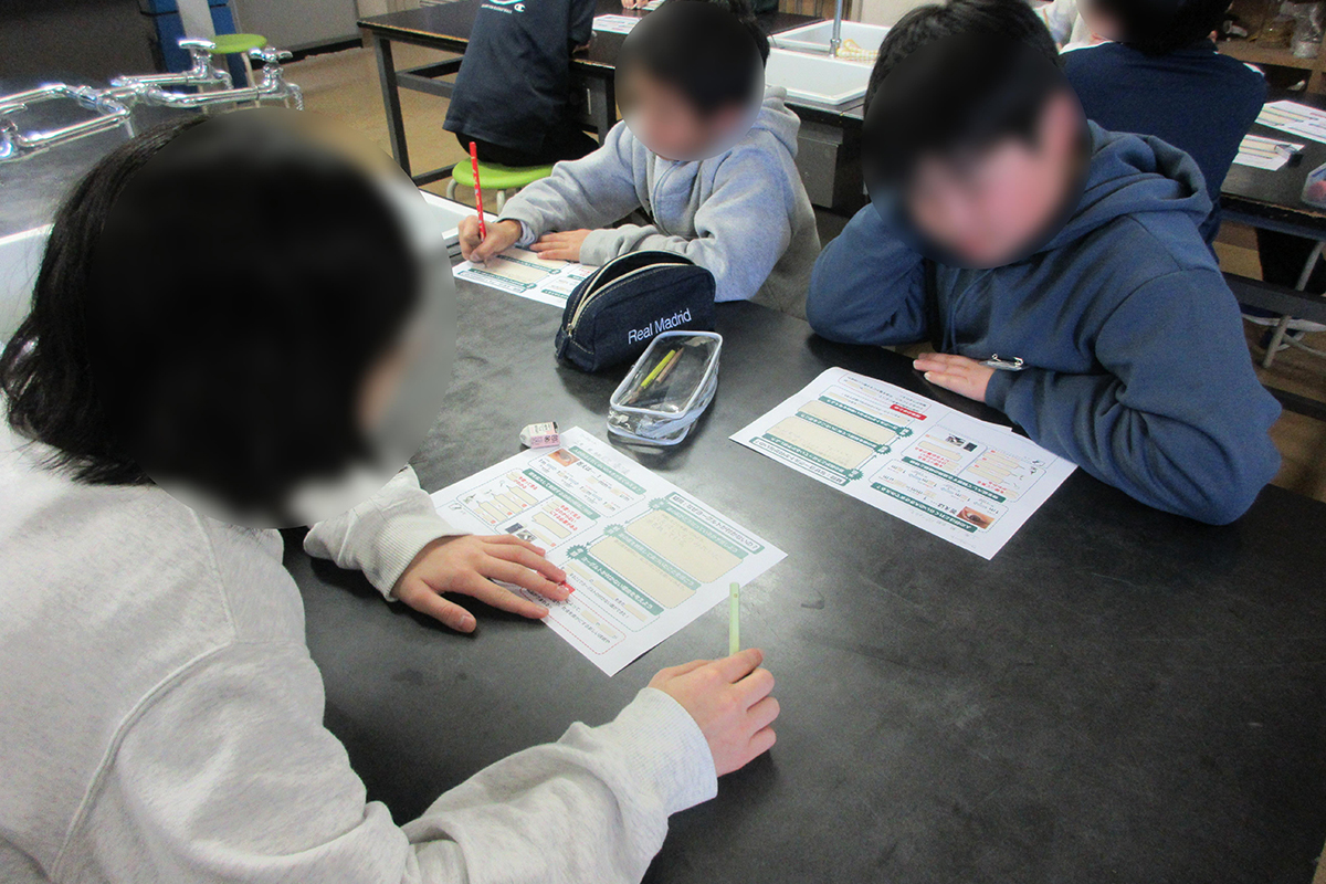 人が目で見ることができない小さなものでも、ルーペや実体顕微鏡、光学顕微鏡や電子顕微鏡など、大きく拡大する道具を使えば見えることができること、また、それぞれの顕微鏡の特徴について学んだ。ヨーグルトが付かない蓋について、なぜヨーグルトが付かないのか「予想」した後、蓋(実物)を「観察」し、なぜ表面に細かいボコボコがあるのかを「考察」した。これは、ハスの葉の水をはじく仕組みを生むデコボコの形を真似た「生物模倣技術(バイオミメティクス)」で、このように、技術や道具の進歩によって見えないものが見えると、“しくみ”や“形”が分かるようになり、社会を豊かにする新しい技術や製品を生まれること、また、様々なことに興味や疑問をもち、予想して、よく観察して考えれば、新しい気づきや疑問がわいてくることを理解した。