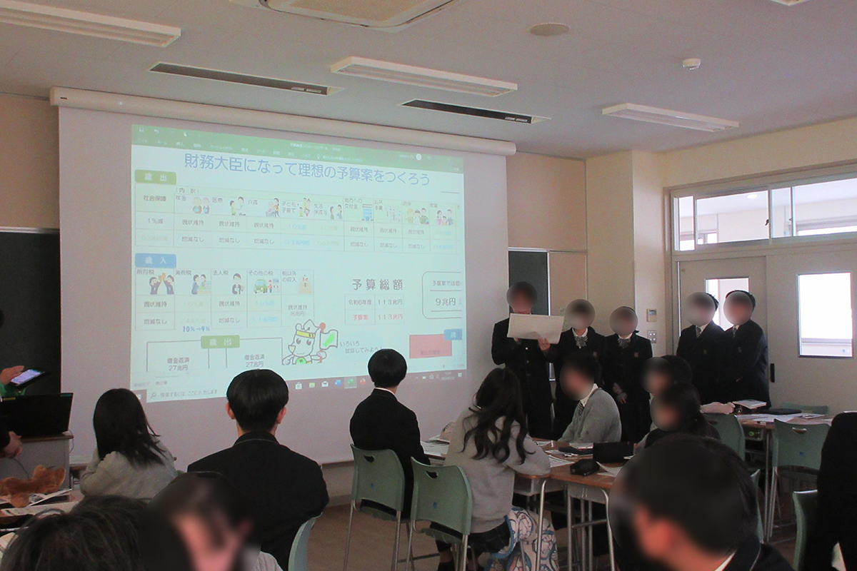 国税や地方税の種類や役割、日本の財政について現状と課題について学び、国民一人ひとりが予算の使い方を真剣に考え、どのように財政バランスを取っていくかを考えることが大切であることを理解した。グループワークでは「財務大臣」になって、どのように税金を集めて、集めたお金をどのように使えば日本の未来を良く出来るのかを考えた。グループごとに日本の未来がどのように良くなって欲しいかテーマを設定し、テーマに沿った予算づくりを実施。グループ毎に考える社会の実現に向けて、令和6年度の国の予算の歳入・歳出を組み直した。グループで考えたより良い社会とそれに向けた予算案の編成ポイントをまとめ、発表した。