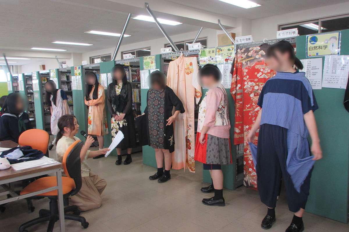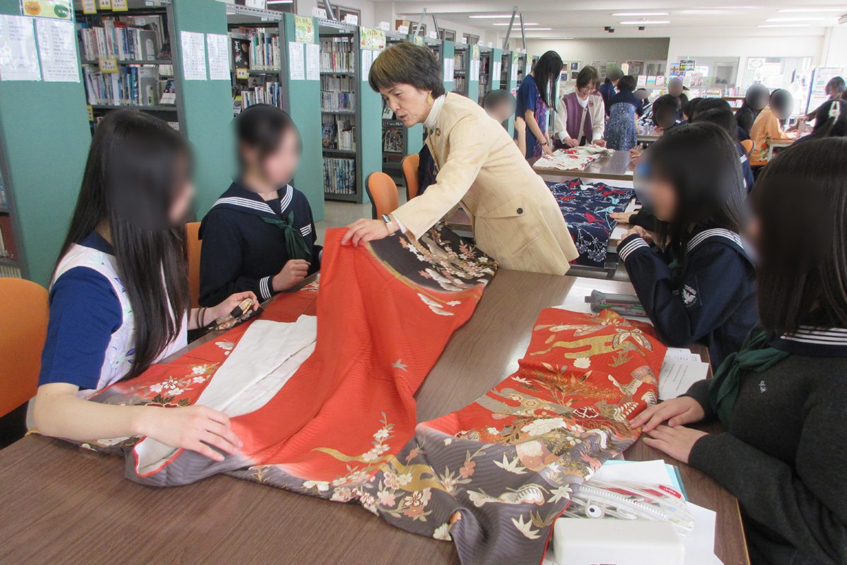 奈良時代から令和に至るまでの着物の歴史・文化のほか、着物や家紋の種類等について学習した。着物には、第一礼装の留め袖・振袖、準礼装の付け下げ・色無地など、様々な種類や格式があり、実際に生地を触って素材の着心地の違いを確かめた。ワークショップでは、着物や浴衣の着付け体験を行い、着付けの手順のほか、現代風にアレンジした着物の着こなし例も学んだ。また、着物をリメイクした様々な洋服(着物リメイク作品)を着用し、ファッションショーを行った。着物の格式クイズや着物のたたみ方を学びながら、和の心や着物文化について理解を深めた。