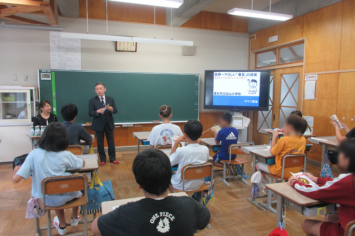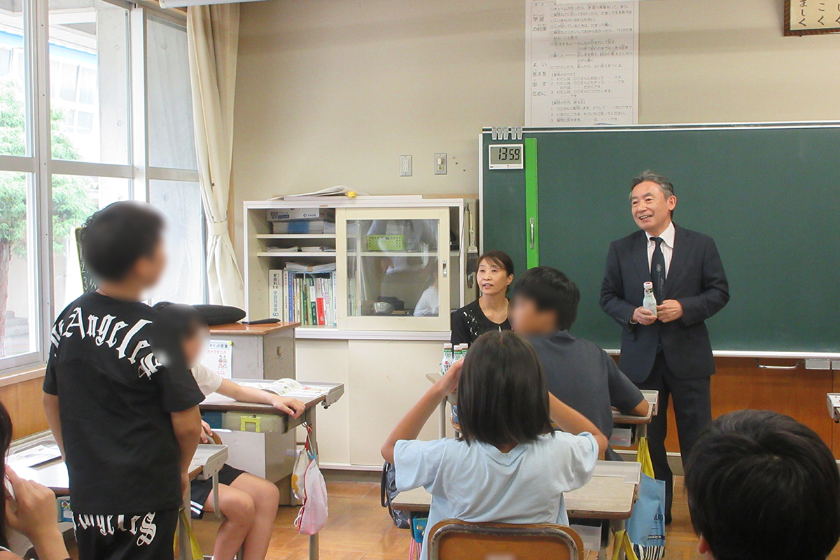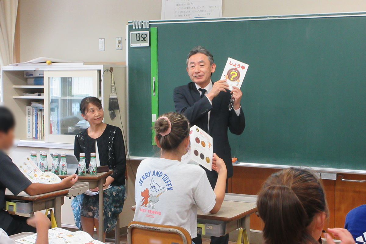 うさぎとかめが競争した場合を例にあげ、陸の上ではうさぎの方が速いが、水の中ではうさぎは泳ぐことができない。空ではどちらも勝負にならないと、それぞれの得意な分野や生きていける場所で自分の実力を発揮することができること(適者生存)について学んだ。東日本大震災で工場など全て流されてしまった後の復興の話、醤油作りで気をつけていること、伝統製法の話、当社で使用されている「しょうゆ天使」をデザインしたやなせたかし氏とのエピソードなどを伺った。最後に、何が起きても生きていけるよう新しい知識を獲得すること、そのために物事に本気で取り組むことの重要性を伝えた。