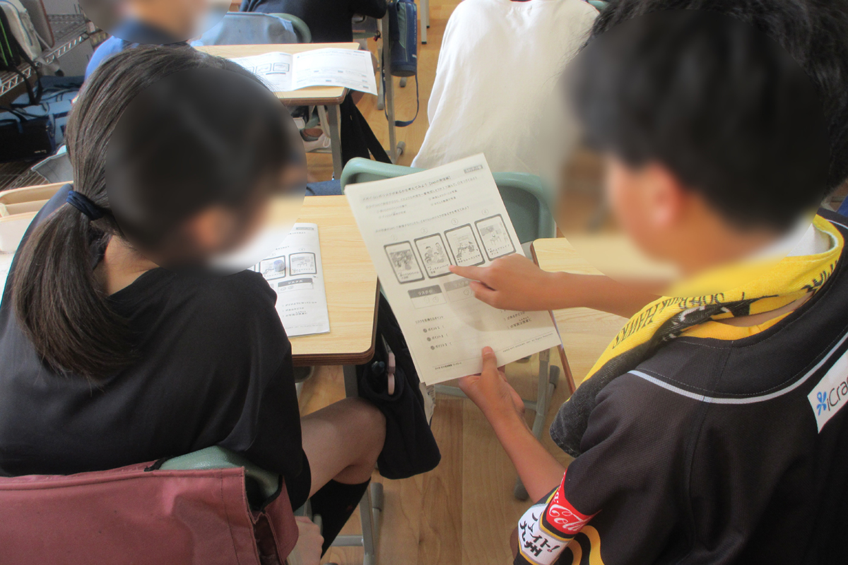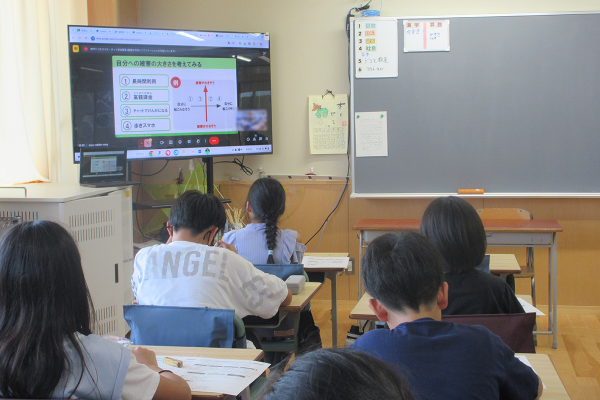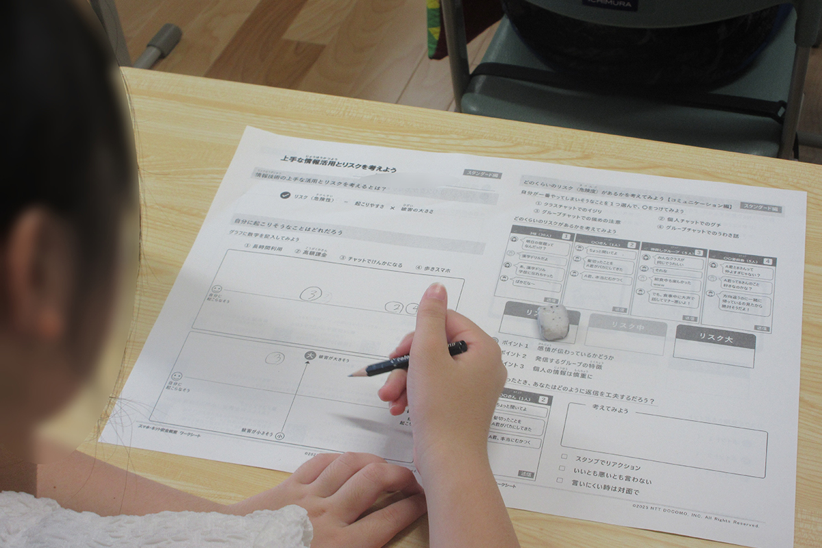 スマホやネットを上手に活用するためにはリスクを知ることが大切であり、「リスク(危険性)=起こりやすさ×被害の大きさ」であることを理解した。その後、自分に起こりそうなリスク(長時間利用、高額課金、チャットでの喧嘩、歩きスマホ)は何か、被害の大きさはどの程度かを考えた。また、スマホやネットの使い過ぎにはどのようなリスクがあり、ネットやSNSをやめたいときはどのような工夫をすると良いかを学んだ。最後にチャットは自分の感情が相手に伝わりにくく誤解が生じたり、些細なことで相手を傷つけてしまったりするリスクがあること、個人情報は慎重に扱わなければいけないこと、チャットでの返信に困ったときの工夫の仕方などを学んだ。