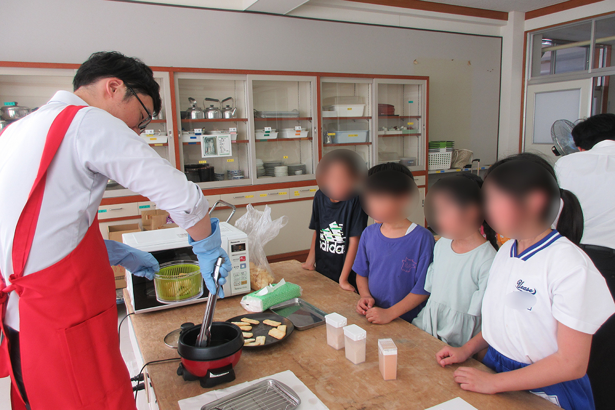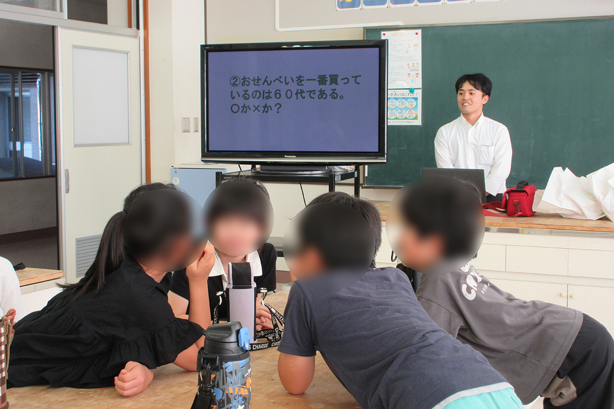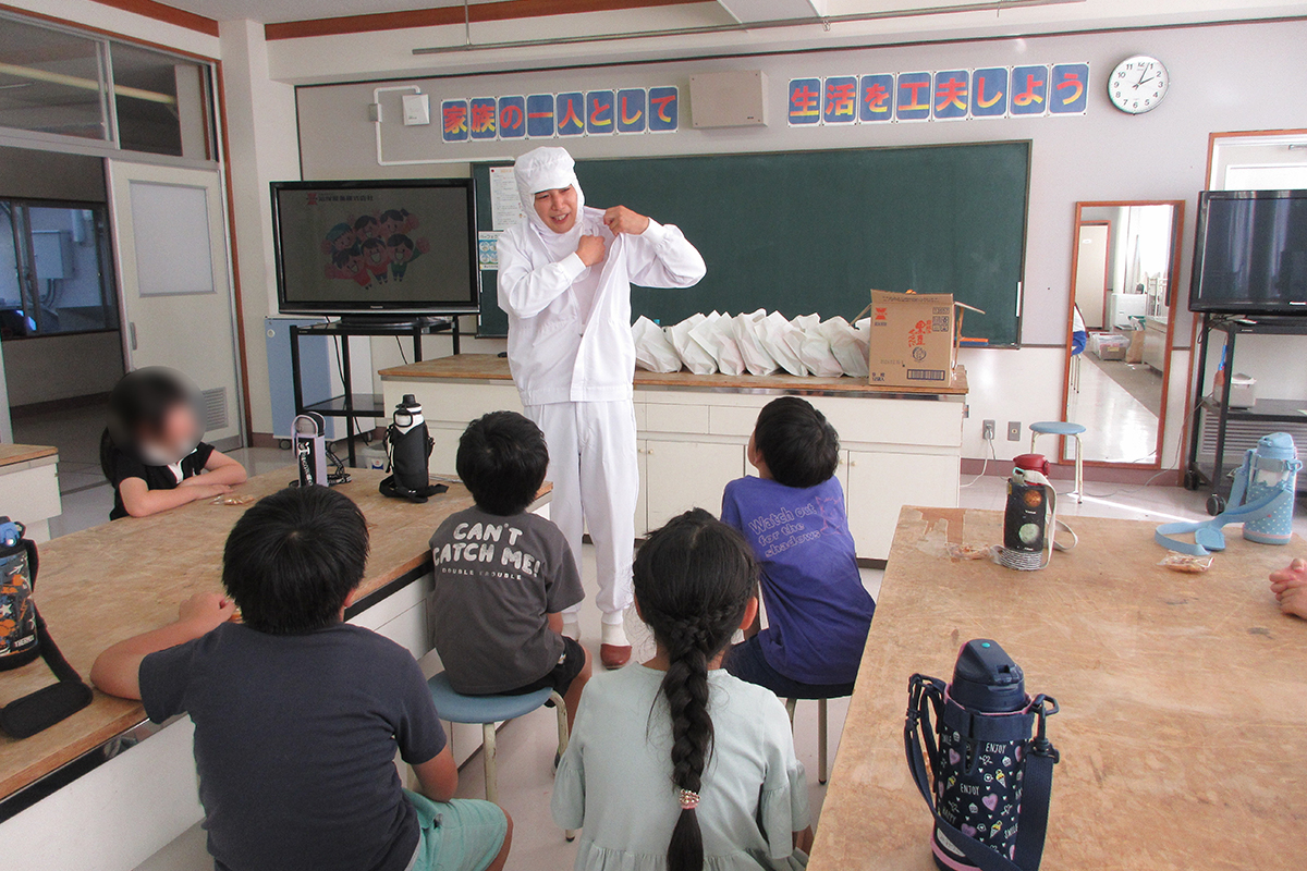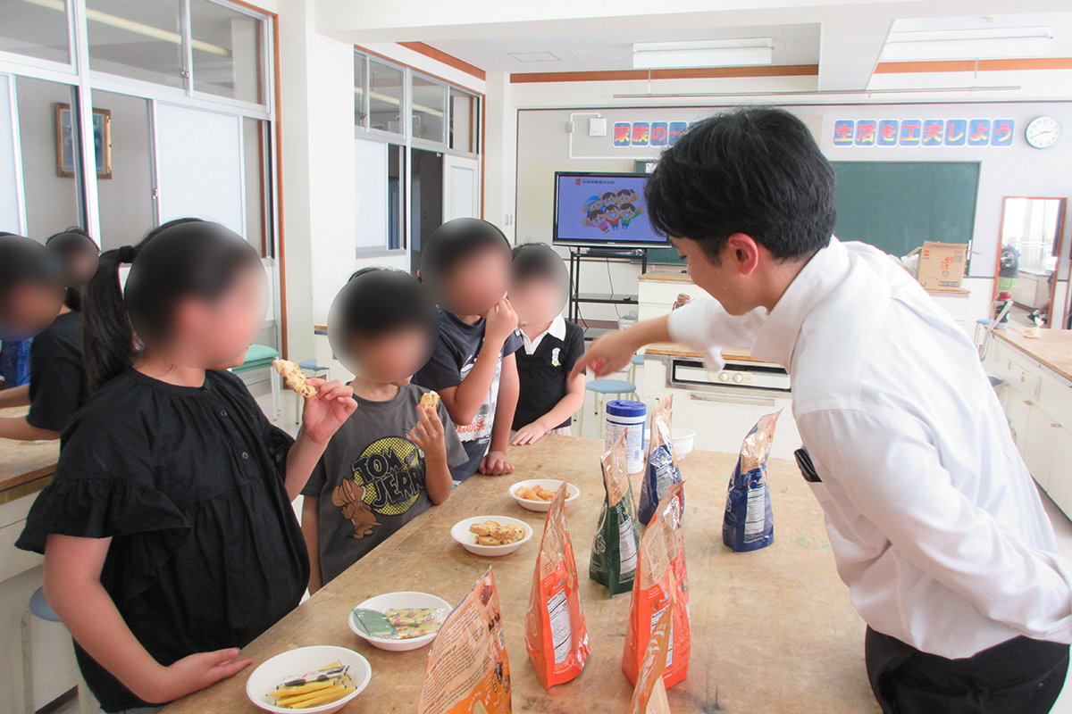 おせんべいの種類や原料、歴史などについて、チーム対抗○×クイズを行ったほか、人気商品「岩塚の黒豆せんべい」が出来上がるまでの工程や、工場での衛生管理について講話や動画を通して学習した。試食体験では、工場から直送された味付け前の「味しらべ」を試食し、おせんべい本来の風味を味わったあと、定番の砂糖醤油味のほか焼きもろこし味、ピザ味の中から好みのフレーバーを選びオリジナルの味付けを楽しんだ。また「田舎のおかき」「大袖振豆もち」「きなこ餅」「バター餅」の計4種類の商品の食べ比べを楽しんだ。