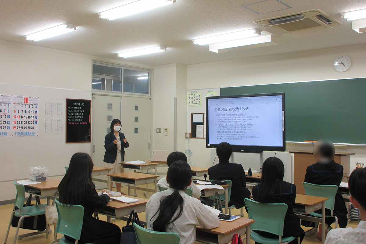 地域の観光産業を活性化させることを目的に、生徒一人ひとりが事前に観光ルートを考え、作成した旅行プランを発表した。各プランについて、質疑応答を行った後、講師から旅行業について説明を受けた。旅行プランを作成する際には、ターゲットを意識することや、移動手段・移動時間を考えることが重要であることを学んだ。また、収穫体験や生産者に会うといったアクティビティが含まれていると、参加者がもう一度参加したくなるなど、プランの魅力を高めるポイントになることも確認した。