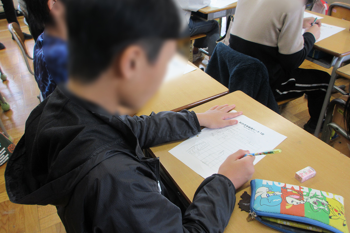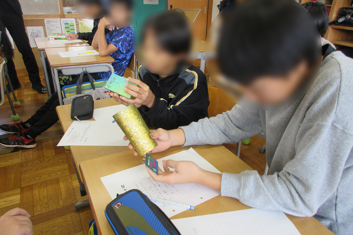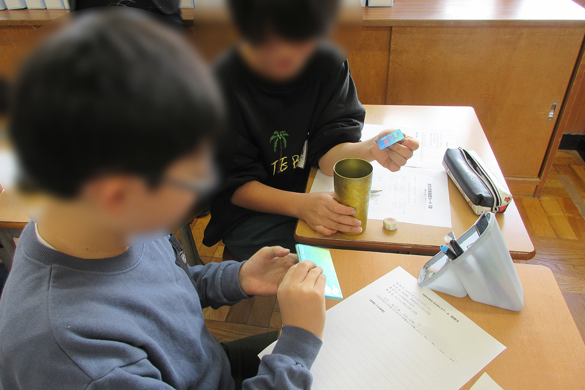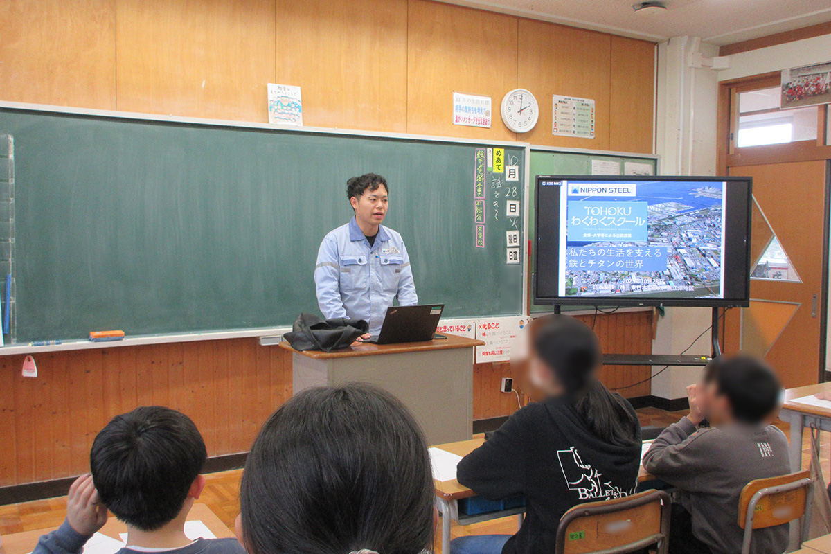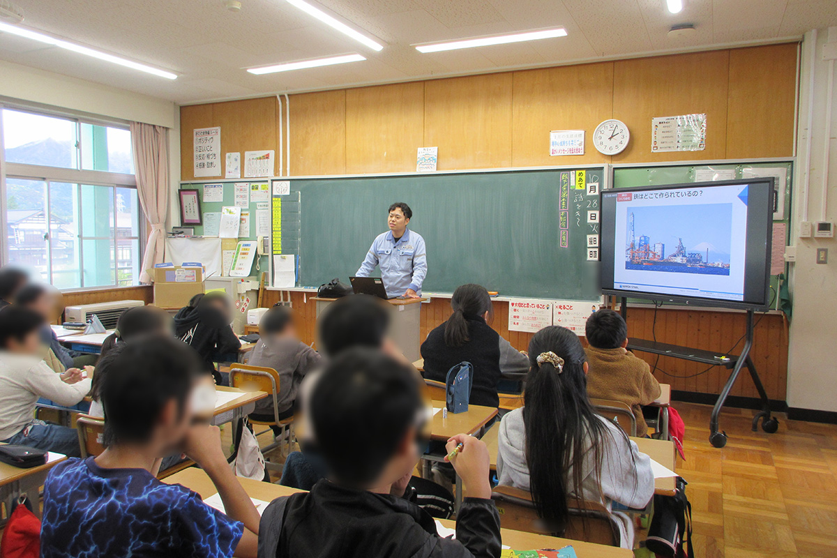 鉄が出来上がる工程について、高炉(鉄鉱石や石炭を溶かして銑鉄にする)・転炉(銑鉄から炭素や不純物を取り除いたり、新たに別の金属を加えたりする)・熱延(鉄に圧力をかけて延ばし、最終的に出荷されていく鋼の板を作る工程)の様子を、動画を通して学習した。日本製鉄で作られている鉄製品(自動車の部品、缶詰飲料缶、家電・住宅設備等)を例に挙げ、鉄は他の素材と比べて圧倒的に使われる量が多いことから、人々の暮らしを支える生活に根差した素材であることを理解した。また、県内の直江津地区にある事業所でチタンを製造していることから、鉄と比べて、軽い(鉄の60%)・強い(鉄の約2倍)・錆びない・色がつくなどの特性を生かしたチタン製品(航空機、船の熱交換器など)についても学び、チタンで作られたタンブラーや名刺入れなど、実際に見て触れて理解を深めた。