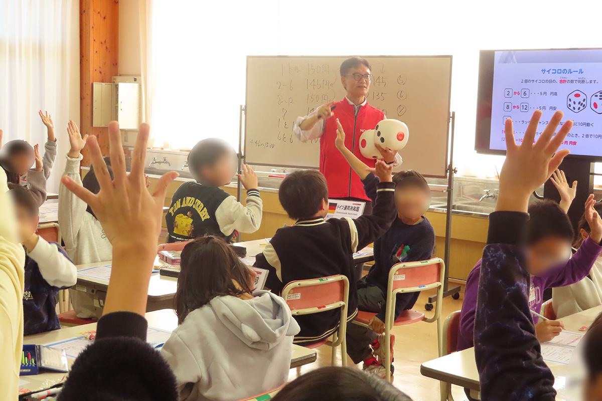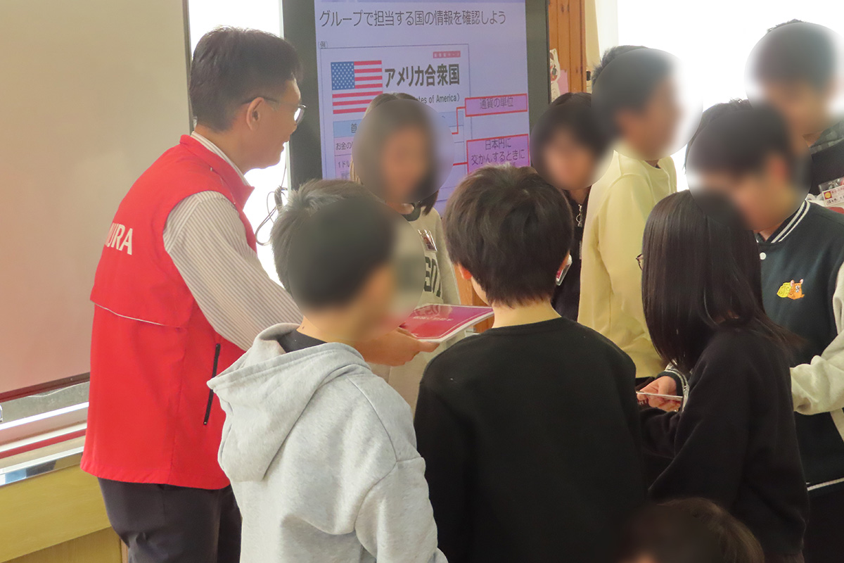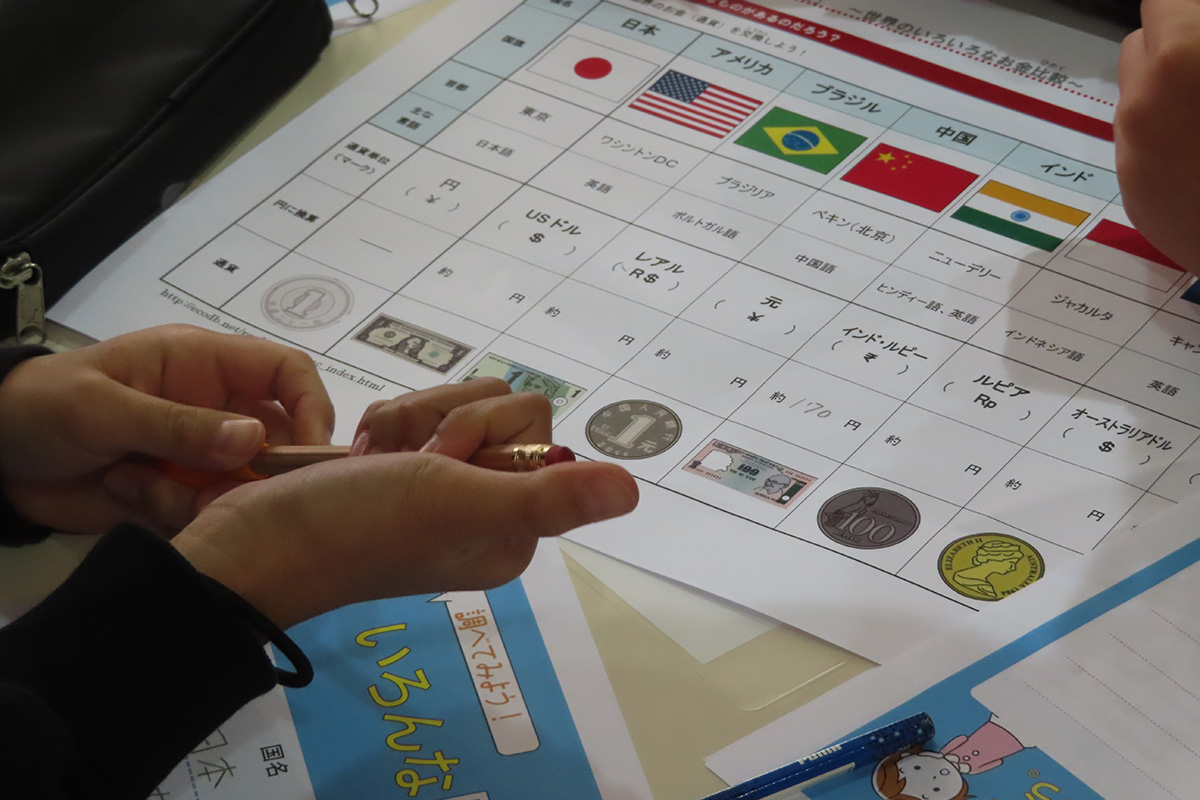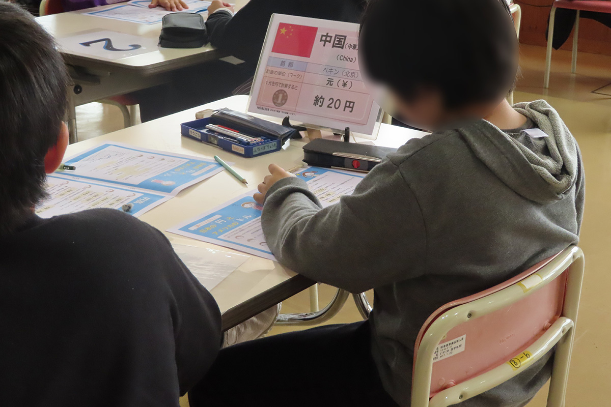 いろいろな国のお金や通貨について調べた後、グループ対抗の通貨交換ゲームを通じて国によって通貨単位が異なることや、円を他の通貨と交換するときの金額の違いについて学習した。また、講師から日本の「円」とアメリカの「ドル」、そして円高・円安について説明を受け、その後、輸入体験ゲームを行うことで理解を深めた。さらに、お金(円)の価値は世の中の変化によって変動するため、テレビや新聞などのニュースに関心を持つことが重要であると学んだ。