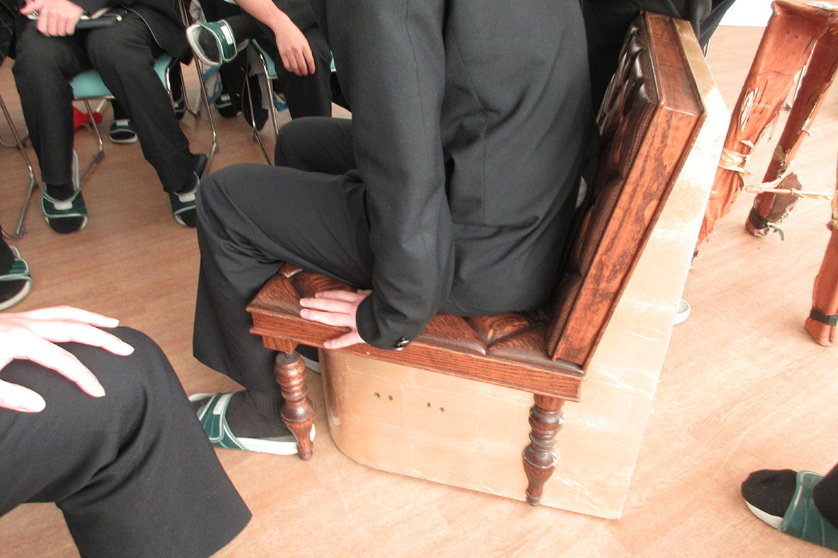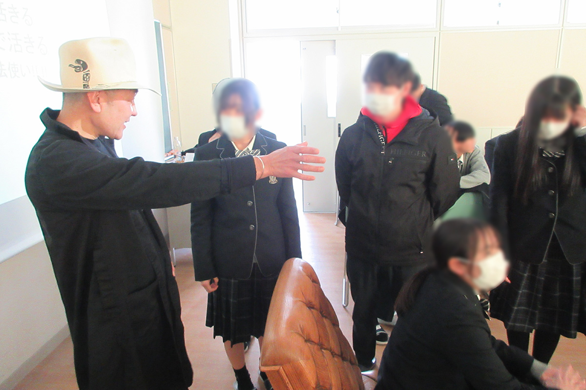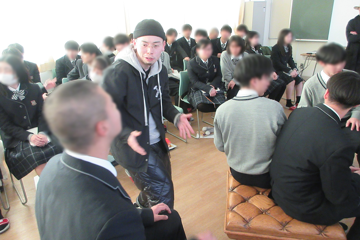 仙台から世界へ発信するだけではなく、世界から仙台に興味・関心を持ってもらうために制作した様々な作品や取り組みを紹介。座ると柔らかく感じる木製の椅子や眺める方向により印象が変わる椅子など、講師がデザインしたオリジナル家具を自由に触れることで、家具や物事の固定概念を取り払った。また、物作りに行き着いた講師自身の半生を振り返りながら、「好きなことはとことんやってみる。明らかに極めてみて、やり切って無理だと思った時は諦めて(見極めて)も良い」こと、「行動をする前に頭で考えすぎて諦めない」こと、「自分を信じられるようになるくらいの経験を積むことが自信につながるため、失敗を怖がらない」ことの大切さなどを学んだ。